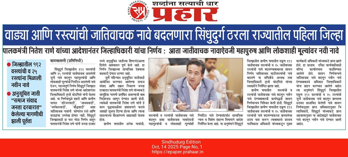 वाड्या आणि रस्त्यांची जातीवाचक नावे बदलणारा सिंधुदुर्ग ठरला राज्यातील पहिला जिल्हा